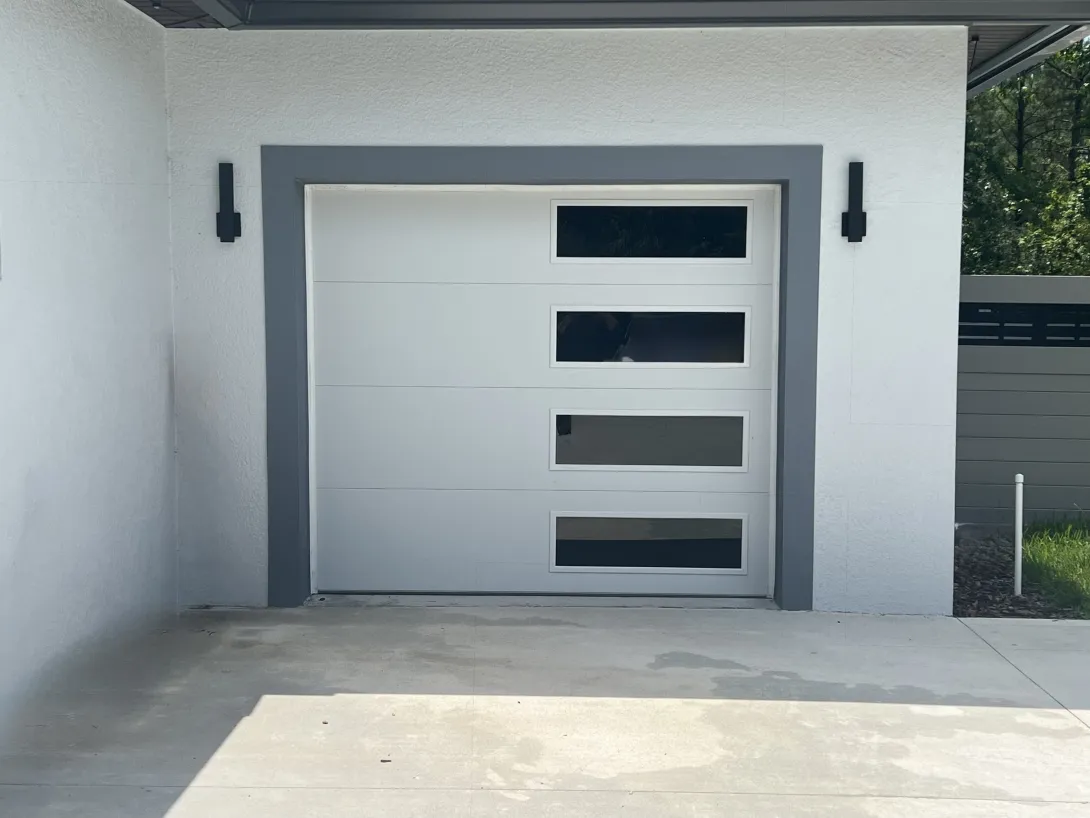 Newly constructed home with flush design garage door and long panel tinted glass.