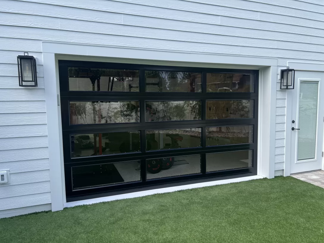 Recently remodeled home that utilized a full view aluminum garage door with black frame and tinted glass.