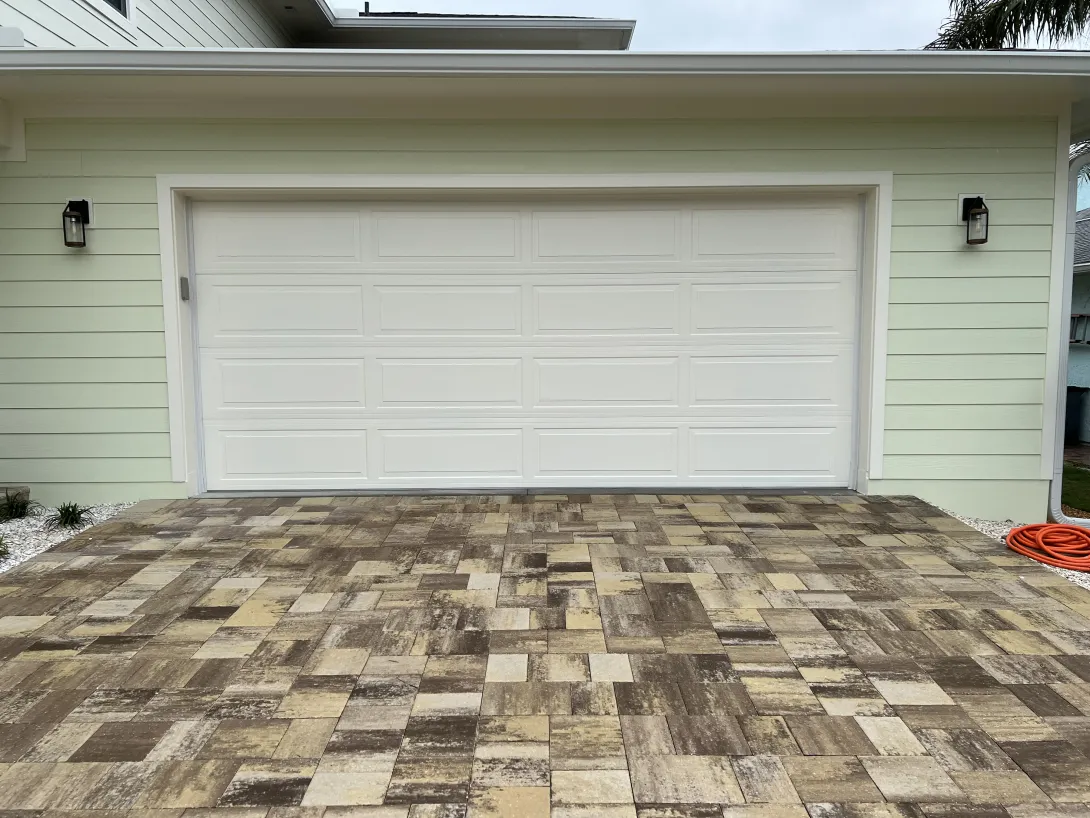 Recently constructed home utilizing a raised long panel garage door.