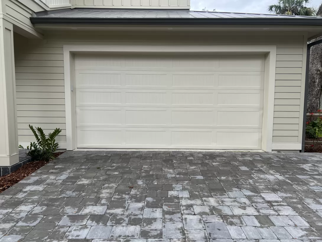 Recently constructed home with long panel stamped carriage house garage door in custom color.